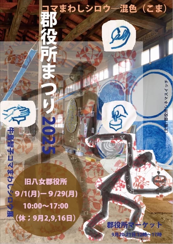 旧八女郡役所は明治時代に八女郡の役所だった建物です。大正時代以降、服部木蝋工場、服部飼料店として地域に親しまれ、長年空き家になっていたのをNPO法人八女空き家再生スイッチが譲り受け、修理後の2017年にオープン。大きな柱と梁、土壁、そして土間がつくる雰囲気を気に入った人たちがコンサート、展示、マルシェなど様々なイベントで利用し、本や映画や音楽等の小さなコミュニティが出来るなど、関わりのあるそれぞれにとって大切な場所になりつつあるような気がしていて、とても嬉しく、ありがたく思っています。そのなかのおひとり、八女市在住の美術作家 牛島智子さんの「コマまわしシロウ」展を中心に郡役所祭りを開催します。今年のテーマは「混色(コマ)」です。ぐるぐる回る八女のコマと色、牛島さんの身体から飛び出して郡役所でも勢いよく回っているようです。会期中、お休みの日以外は自由にご覧になれます。コマも回せます。どうぞ、お越しください。