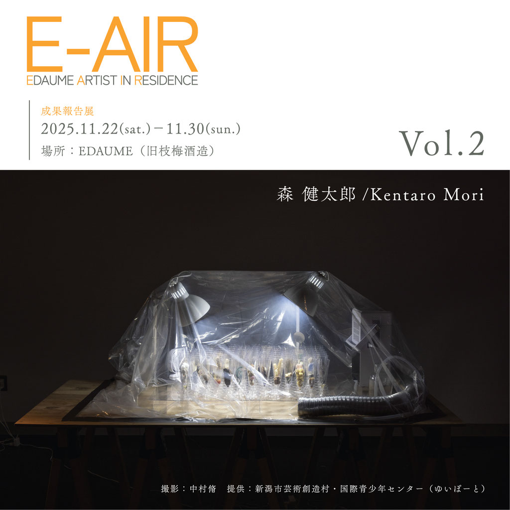 EDAUMEでは今年度よりアーティスト・イン・レジデンス企画『E-AIR』を実施する運びとなりました。Vol.2となる今回は、福島県を拠点に活動されている森健太郎さんに、約1ヶ月間の滞在制作を行っていただきました。その活動報告展を、EDAUME内東の蔵にて開催します。ぜひご覧ください。