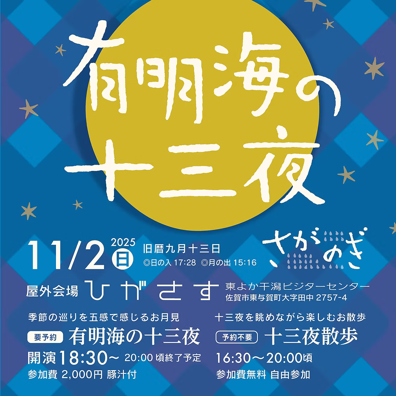 中秋の名月に対して後の月と呼ばれる「十三夜」。古来より、日本人はこの満ちる前の月に美しさを見出していました。日本一の干満差を誇る有明海の潮の満ち引きは、月と太陽と地球の引力が作用しています。星々が織りなすダイナミズムと古人の感性に思いを馳せながら、有明海をバックに物語と音楽を楽しむ夕べです。