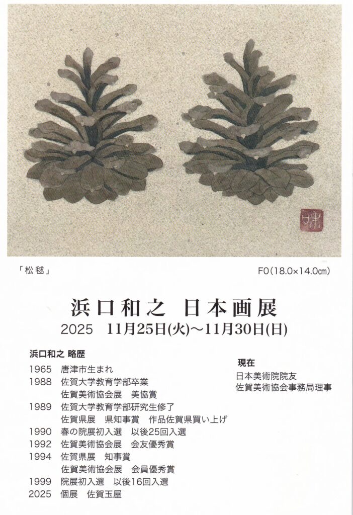 日本美術院院友、佐賀美術協会事務局理事としても活躍する、佐賀市在住の日本画家・浜口和之さんによる、2年ぶりとなる個展です。本展では、草花や風景を題材に約40点を展示。岩絵具や金銀箔など、日本画特有の伝統的な素材を用いながら、その特性を生かした独自の表現に挑んだ意欲作がそろう。自然の息づかいと繊細な技法が調和した世界観を、ぜひ会場で堪能してほしい。