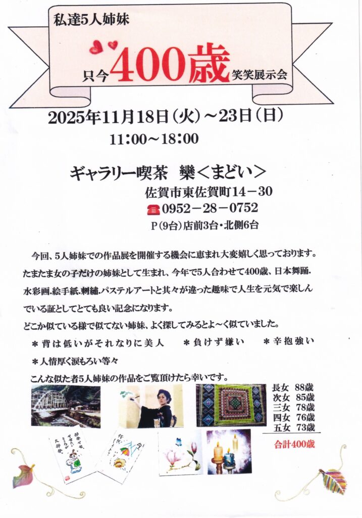 私達5人姉妹 只今400歳 笑笑展示会 あと5日で開催 2025年 11月 18日(火) – 23日(日) ギャラリー喫茶 欒(まどい) 一覧へ戻る アート 開催情報 日程 2025年 11月 18日(火) – 23日(日) 時間 11:00~18:00 会場 ギャラリー喫茶 欒(まどい) 840-0821 佐賀県佐賀市東佐賀町14-30 料金 ワンオーダーをお願いします 主催 5人姉妹 お問い合わせ ギャラリー喫茶 欒(まどい) 0952-28-0752 情報訂正のご連絡