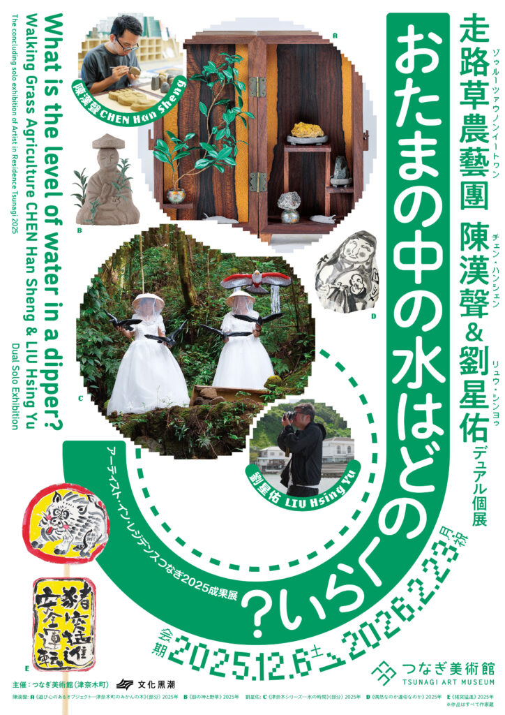 陳漢聲と劉星佑から成る台湾のアートユニット「走路草農藝團」は、8月から11月にかけて「アーティスト・イン・レジデンスつなぎ2025」の招聘作家として、津奈木町や近隣地域を中心とした熊本の風土や信仰、生態系と人の営みなどについてリサーチを重ね、新たな制作に取り組みました。