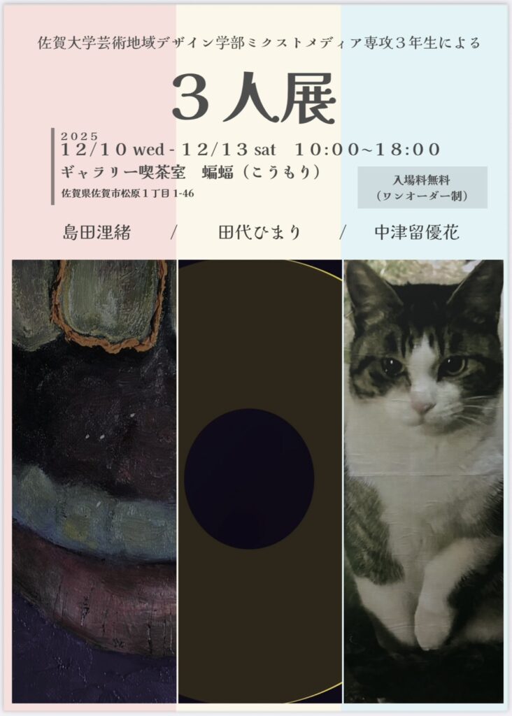 佐賀大学芸術地域デザイン学部ミクストメディア専攻3年生による 3人展 あと20日で開催 2025年 12月 10日(水) – 13日(土) ギャラリー喫茶室 蝙蝠(こうもり) 一覧へ戻る アート 佐賀大学芸術地域デザイン学部ミクストメディア専攻学生、島田浬緒、田代ひまり、中津留優花によるグループ展です 開催情報 日程 2025年 12月 10日(水) – 13日(土) 時間 10時〜18時 会場 ギャラリー喫茶室 蝙蝠(こうもり) 840-0831 佐賀県佐賀市松原1-1-46 料金 観覧無料 + 喫茶オーダー 主催 中津留優花 注意事項 喫茶オーダーをお願いします お問い合わせ 喫茶室 蝙蝠(こうもり) cafekoumori@gmail.com 情報訂正のご連絡