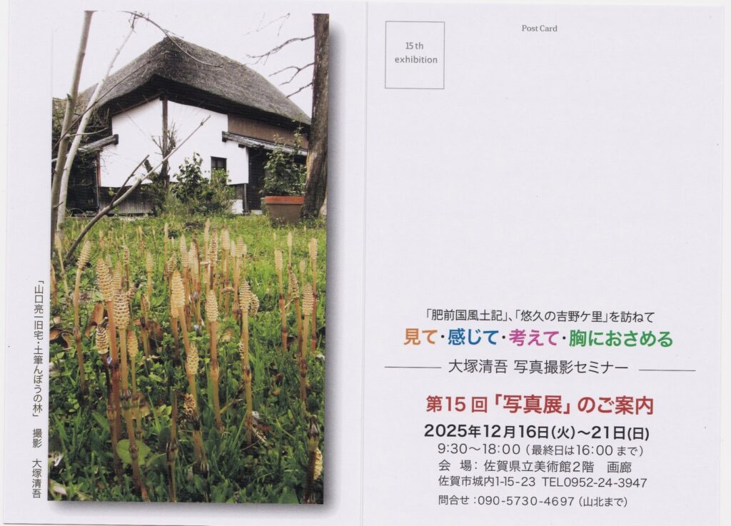 本会の主題である肥前国風土記と悠久の吉野ヶ里の写真を中心に、 佐賀の風景、 花など、今年度の活動の中で撮影した作品を全紙サイズ50点を展示します。