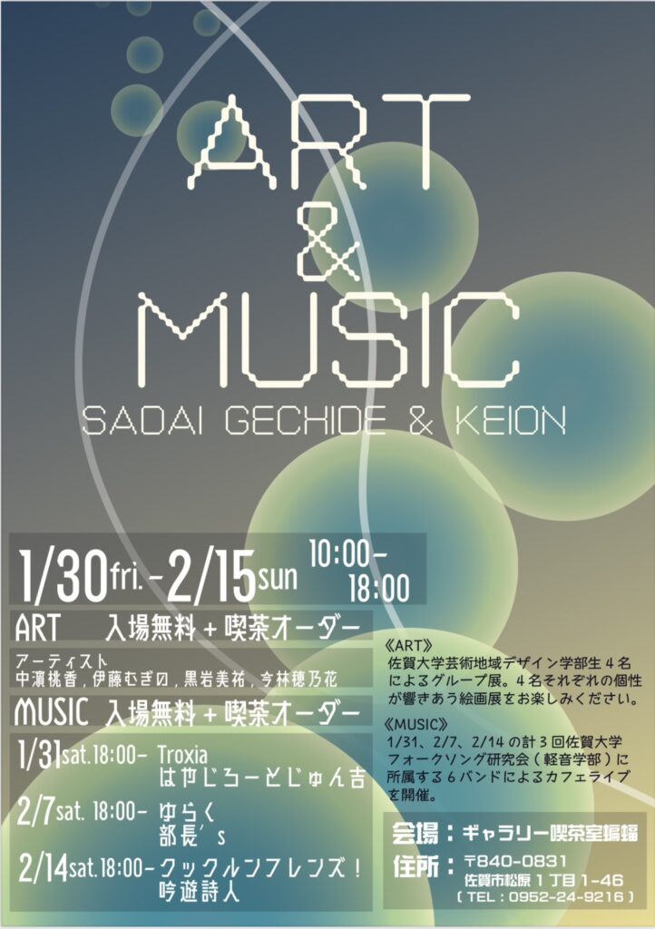 ART & MUSIC SADAI GECHIDE & KEION あと46日で開催 2026年 1月 30日(金) – 2月 15日(日) ギャラリー喫茶室 蝙蝠(こうもり) 一覧へ戻る アートステージ 佐賀大学芸術地域デザイン学部生4名 、 中濵桃香、伊藤むぎの、黒岩美祐、今林穂乃花のグループ展です。 ミュージック 1/31(土)18:00〜 Troxia、はやじろーとじゅん吉 2/7 (土)18:00〜 ゆらく、部長’s 2/14(土)18:00〜 クックルンフレンズ!、吟遊詩人 佐賀大学フォークソング研究会に所属するバンドによるカフェライブを開催♪ 開催情報 日程 2026年 1月 30日(金) – 2月 15日(日) 時間 10時〜18時 会場 ギャラリー喫茶室 蝙蝠(こうもり) 840-0831 佐賀県佐賀市松原1-1-46 料金 観覧無料 + 喫茶オーダー 主催 中濵桃香 注意事項 喫茶オーダーをお願いします お問い合わせ 喫茶室 蝙蝠(こうもり) cafekoumori@gmail.com 情報訂正のご連絡