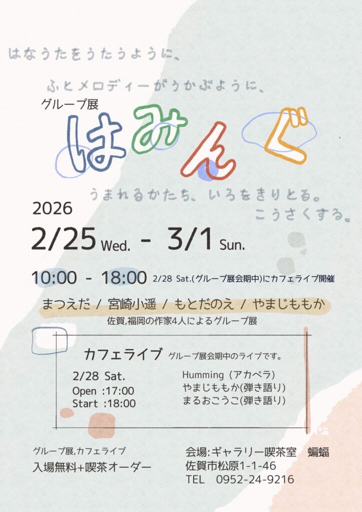 グループ展「 はみんぐ 」 あと42日で開催 2026年 2月 25日(水) – 3月 1日(日) ギャラリー喫茶室 蝙蝠(こうもり) 一覧へ戻る アートステージ 佐賀、福岡の作家4人、まつえだ、宮崎小遥、もとだのえ、やまじももかによるグループ展 カフェライブ 2/28 (土)18:00〜 Humming(アカペラ) 、まるおこうこ(弾き語り)、やまじももか(弾き語り) 開催情報 日程 2026年 2月 25日(水) – 3月 1日(日) 時間 10時〜18時 カフェライブ2/28 (土)18:00〜 会場 ギャラリー喫茶室 蝙蝠(こうもり) 840-0831 佐賀県佐賀市松原1-1-46 料金 観覧無料 + 喫茶オーダー 主催 やまじももか 注意事項 喫茶オーダーをお願いします お問い合わせ 喫茶室 蝙蝠(こうもり) cafekoumori@gmail.com 情報訂正のご連絡