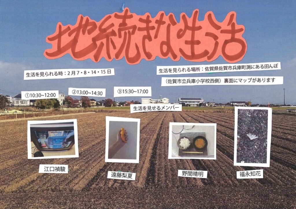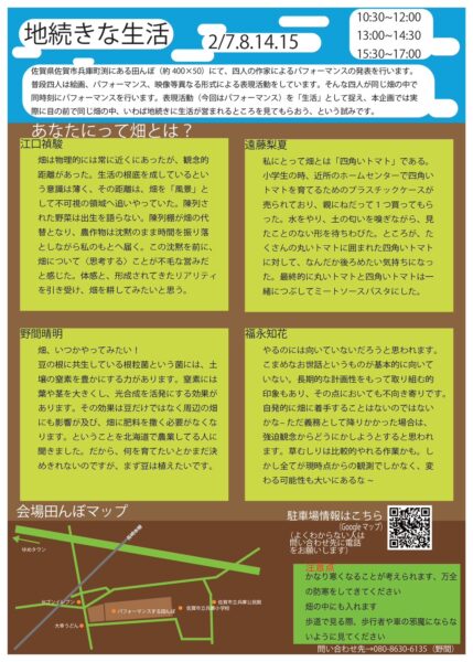 佐賀大学芸術地域デザイン学部の在学生と卒業生4名による、田んぼという生活と生産の場を舞台としたパフォーマンスを行います。それぞれのパフォーマンスが田んぼの中で同時多発的かつ無秩序に展開します。互いに明確な領域と関係性をもたないまま行われる行為が、やがてその場特有の磁場を立ち上げ、絶えず更新される身体の痕跡を残すことで、田んぼの中に一時的な生活の気配が生まれるかもしれません。