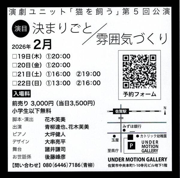 演劇ユニット「猫を飼う」第5回公演 決まりごと/雰囲気づくり あと7日で開催 2026年 2月 19日(木) – 22日(日) UNDER MOTION GALLERY 一覧へ戻る アートステージ 開催情報 日程 2026年 2月 19日(木) – 22日(日) 時間 19日(木)①20:00 20日(金)①20:00 21日(土)①16:00②19:00 22日(日)①13:00②16:00 会場 UNDER MOTION GALLERY 840-0825 佐賀県佐賀市中央本町1-10 料金 前売り3,000円(当日3,500円) 小学生以下無料 主催 猫を飼う お問い合わせ 080(6446)7186(青柳) 情報訂正のご連絡